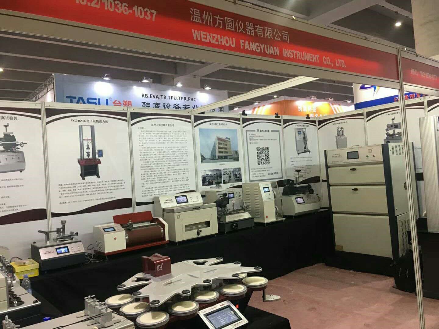 溫州方圓儀器有限公司應展覽會主辦方邀請,參加此次展會,并實物展出了:FY600日曬氣候老化儀、YG028萬能材料試驗機、FXC651耐折試驗機、YG401FII織物平磨儀、XGMCIIA皮革摩擦色牢度儀、FXC621耐磨試驗機、FXC171剝離試驗機、FXC623鞋用纖維曲撓儀、FXC627鞋帶與鞋帶耐磨試驗機等16種鞋類、皮革檢測儀器。
